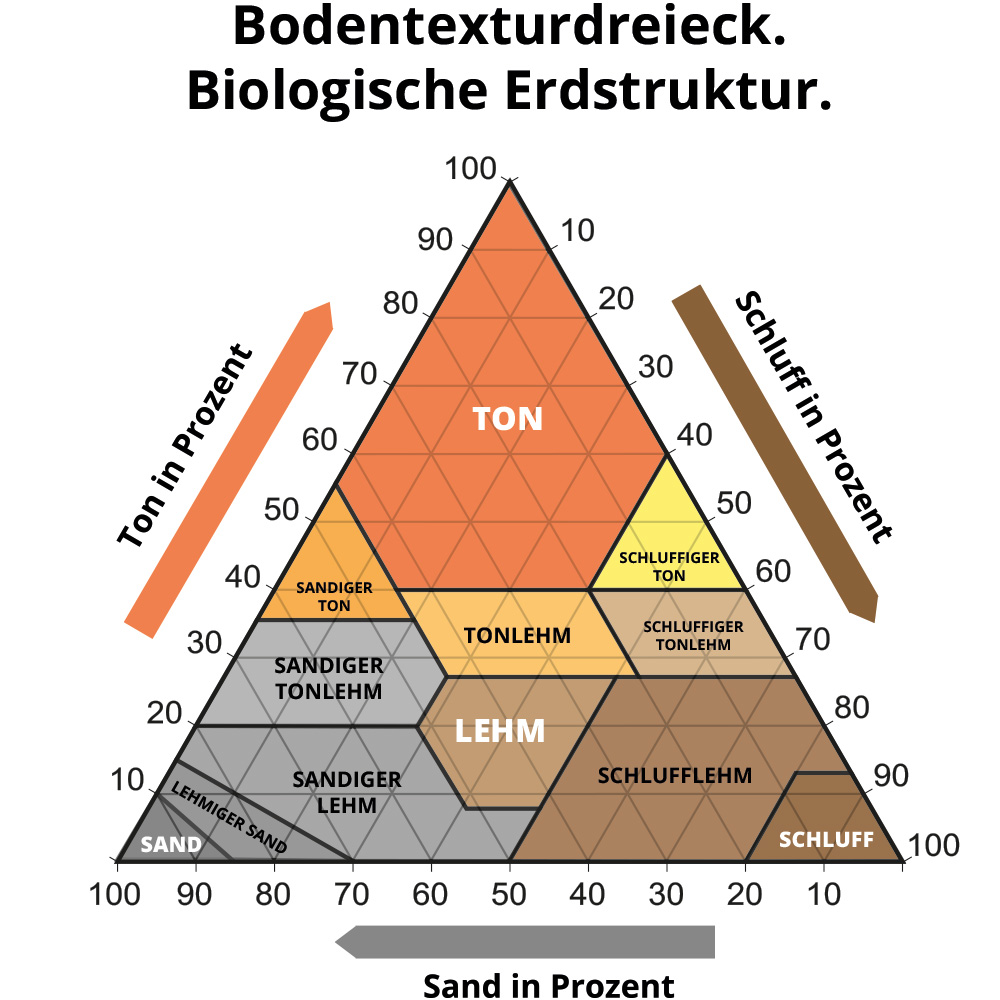 Wir sehen, dass die Mischungsverhältnisse der drei Grundbestandteile des Lehms, also Sand, Schluff und Ton, innerhalb definierter Grenzen schwanken können. Zudem kann auch noch gröberes Material, wie Kies und Steine, darin enthalten sein.