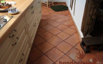 - Art Blättermann Terracotta-Fliesen mit passenden Sockelleisten in der Küche