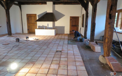 Hier möchten wir Ihnen anhand einer Fotoserie ein ganz besonderes Art Quappe-Projekt vorstellen. In der Diele eines historischen Fachwerkhauses wurden unsere Tonplatten fachmännisch „Welle an Welle“ verlegt. So soll es ein und nur so ergibt die wellige Form einer Fliese dann als Boden aus vielen Fliesen auch ein entsprechendes Gefühl beim Darüberlaufen. Eben das originale Gefühl, das beim Betreten eines 100 Jahre alten historischen Bodens entsteht. Das macht, neben den ihr eigentümlichen Farbunterschieden, den altertümlichen Charme der Art Quappe aus.