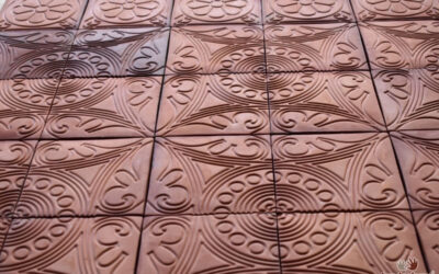 Machen Sie Ihre handgeformten Terracottafliesen mit einem Relief zu einem wahren Kunstwerk, das zugleich Teil Ihres Alltags ist. Lassen Sie in die Fläche Ihrer Fliesen ein Muster, eine Form oder Figur hineinprägen. Die positiven Klimaeigenschaften unserer Bodenfliesen werden nicht beeinträchtigt. Sie bleiben trittsicher. Zugleich ist Prägung tief genug, um auch bei erhöhter Beanspruchung erhalten zu bleiben
