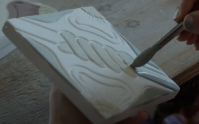 Während des Trocknungsprozesses der Relieffliesen glätten wir die geprägten Motive per Hand in mehreren Durchgängen und runden dabei die Kanten ab.