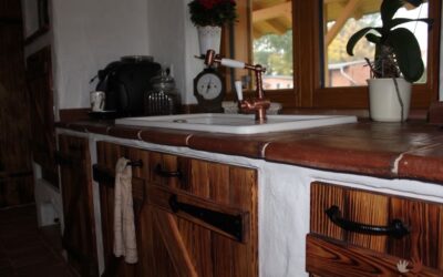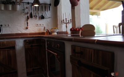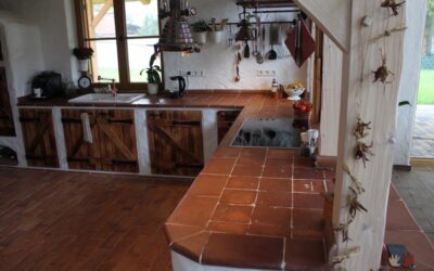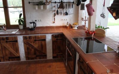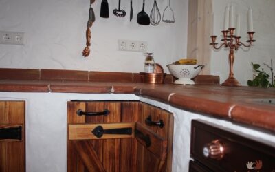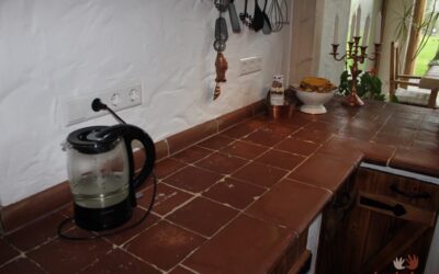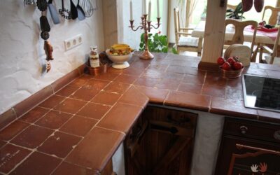 - Der satte warme Farbton auf der Arbeitsplatte aus Terracotta harmoniert mit rustikalen Holzbalken und weißen Kalkputzoberflächen.