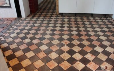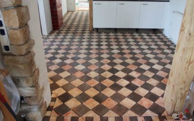 - Übergang zwischen Küche und Wohnzimmer: Terracotta Mosaikfliesen treffen auf Schachbrettfliesen (hier noch unverfugt).