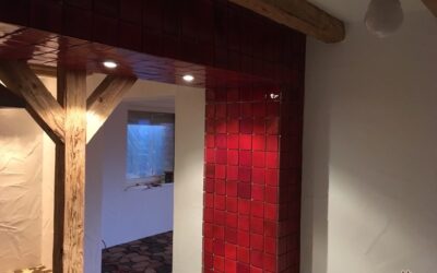 - Integrierte Lichtspots bringen die intensive Farbe der Art Levis Wandfliesen gut zur Geltung (hier noch unverfugt).