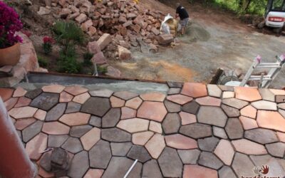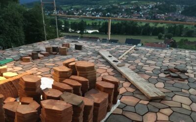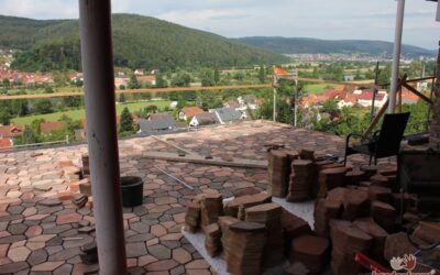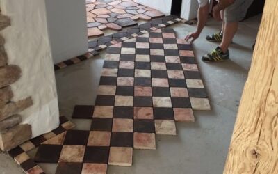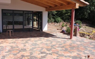 - Der Terracottaboden entsteht: Verlegearbeiten vom handgeformt-Team auf der Terrasse.