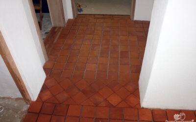- Die rustikalen Fliesen im Flur mit Rautenverlegung im Türdurchgang, hier noch unverfugt.