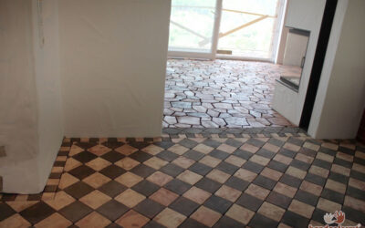- Fertig verlegte und gewachste Mosaikbodenfliesen im Wohnzimmer.