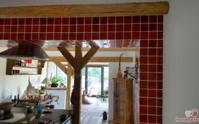 Ein außergewöhnliches Gestaltungselement sind auch die Wandfliesen in der Küche: Tiefrot glänzend setzt hier die Wandfliese Art Levis einen knalligen Farbkontrast zur schlicht geweißten Wand. Die glasierten Terracotta-Fliesen spiegeln das Licht und bringen so zusätzliche Helligkeit in den hinten gelegenen Küchenbereich.
