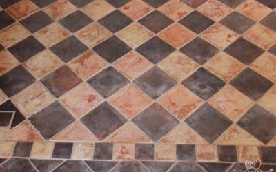 - Rustikales Flair und Individualität pur mit Schachbrettfliesen und Mosaikboden aus Terracotta in der Küche.