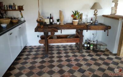 - Der rustikale Küchenboden aus weißen und schwarzen Terracotta-Fliesen toll kombiniert mit einer alten Werkbank aus Holz.
