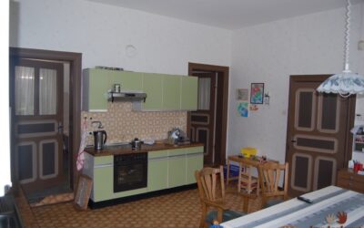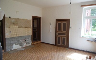 - Die Küche vor dem Umbau mit altem PVC-Bodenbelag.