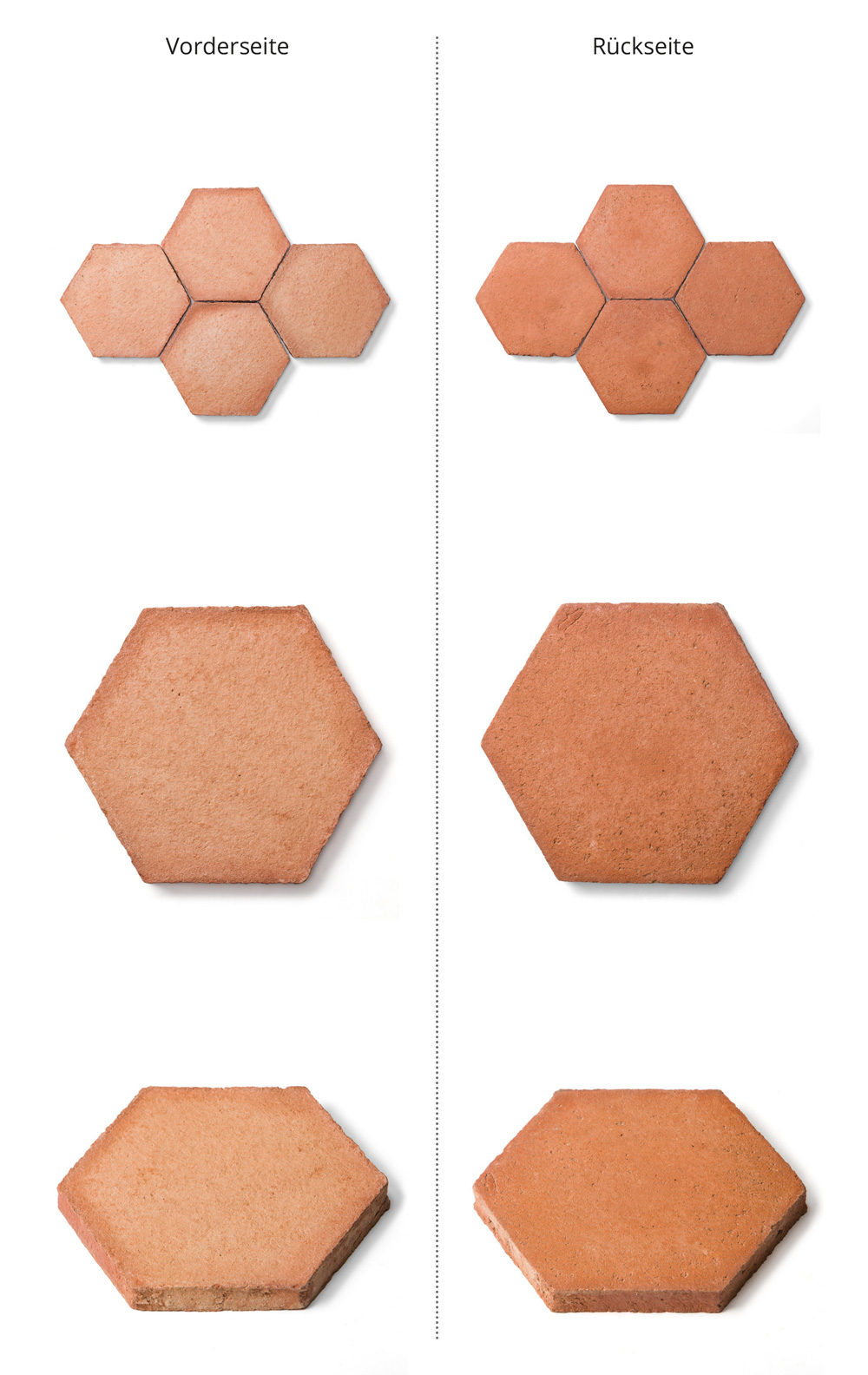 in langjährigen Praxisversuchen auf gesunden Wohnkomfort optimiert. Beim Brand entsteht nicht nur die Farbe, sondern auch die charakteristische, rutschfeste Oberfläche, die mit ihrer narbig-rissigen Struktur, kleineren Einschlüssen, Spalten, Klüften und Hohlräumen an historische Terracotta-Fliesen angelehnt ist und sich sowohl optisch und als auch qualitativ deutlich von industriell gefertigten Zement-Imitaten abhebt.