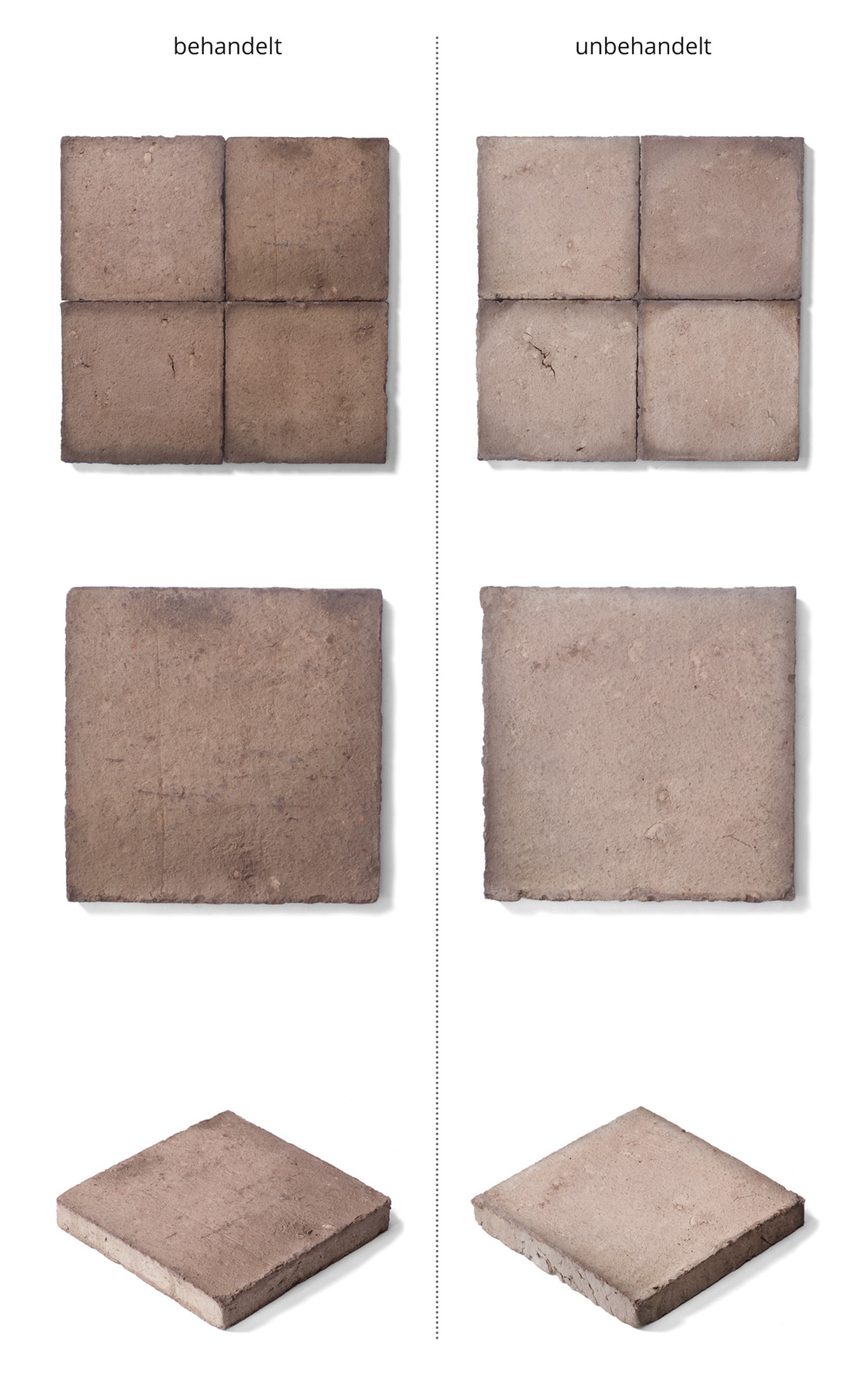 Die Art Antiquus erweckt einerseits den Eindruck, als sei sie bereits seit Jahrhunderten in Gebrauch und genügt andererseits aber zeitgemäßen Ansprüchen an Maßhaltigkeit und schadstofffreie Materialien. Als handgestrichene Fliese oder -platte aus dem Holzrahmen erzeugt die unterschiedliche Körnung eine leicht raue Oberfläche und damit einen absolut rutschfesten Bodenbelag. Eingeschlossene Lehmklumpen mit unterschiedlicher Schrumpfung führen zuweilen zu leichter Rissbildung, die sich aber nicht auf die Festigkeit und Stabilität der Fliese auswirkt. Diese oberflächlichen Narben sind durchaus gewollt, denn sie unterstreichen den unvergleichlichen Charakter dieser Fliese, die sich optisch und qualitativ von industriell gefertigten Zement-Imitaten abhebt.