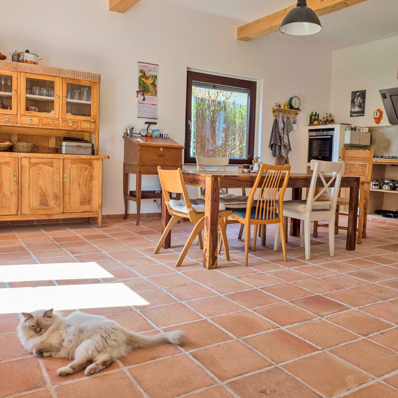 Als DER Klassiker unserer Bodenfliesen-Kollektion ist die Art Blättermann zugleich auch unser beliebtestes Produkt. Der selbstgewisse Charakter der klassischen Terracottafarbe verzaubert jeden Raum, ob groß oder klein, hell oder dunkel, und verbreitet im Zusammenspiel der Fliesen eine warmes Leuchten. Diese individuelle Raumwirkung kann durch eine fugenlose oder wechselseitige Verlegung von Vor- und Rückseite noch gesteigert werden, denn die Art Blättermann ist wie alle unsere natürlichen Lehmprodukte durchgehend farbecht. Natürlich ist diese Terrakotta-Fliese geeignet für den Einsatz überall im Haus sowie im überdachten Außenbereich.