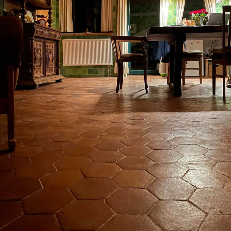 in langjährigen Praxisversuchen auf gesunden Wohnkomfort optimiert. Beim Brand entsteht nicht nur die Farbe, sondern auch die charakteristische, rutschfeste Oberfläche, die mit ihrer narbig-rissigen Struktur, kleineren Einschlüssen, Spalten, Klüften und Hohlräumen an historische Terracotta-Fliesen angelehnt ist und sich sowohl optisch und als auch qualitativ deutlich von industriell gefertigten Zement-Imitaten abhebt.