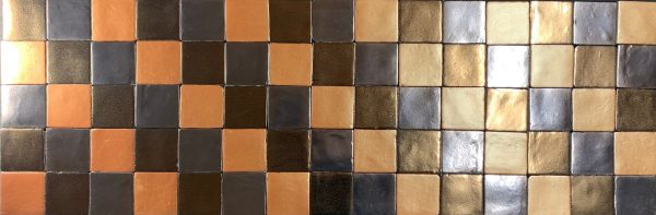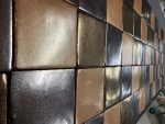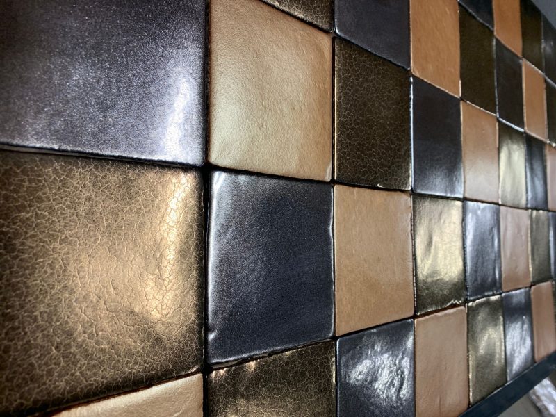 Handgefertigte, aus Lehm gebrannte und einseitig glasierte Wandfliese, Tony´s Küchenspiegelkreationen, Metallic