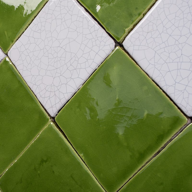 Fliesenspiegel für Küchenrückwand oder Bad aus Lehm gebrannten, handgefertigten und einseitig glasierten Wandfliesen, irish green mit weiß craquelé. Bei einer Musterbestellung müssen 2 ausgewählt werden, dass alle Farben geliefert werden.