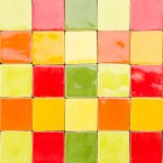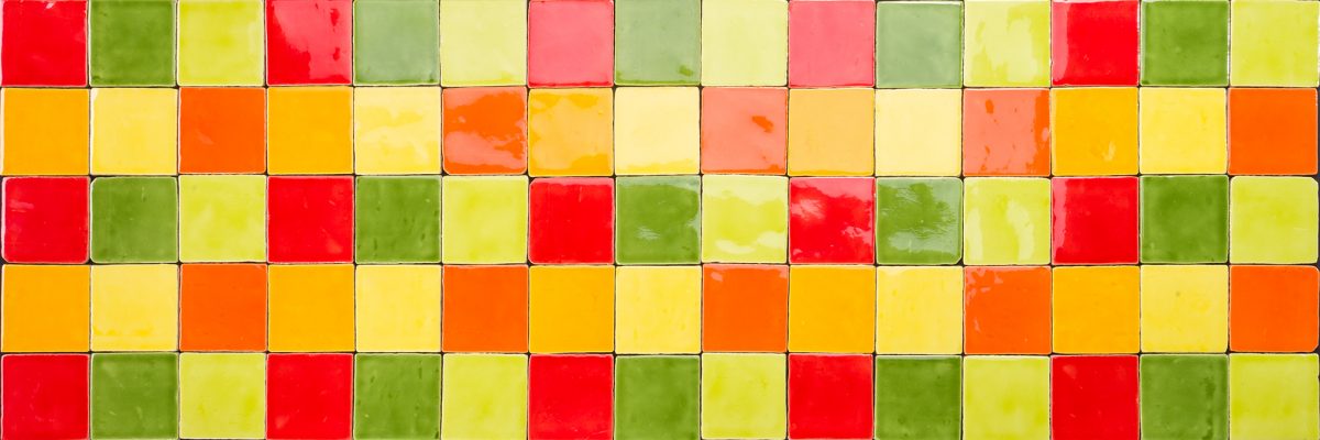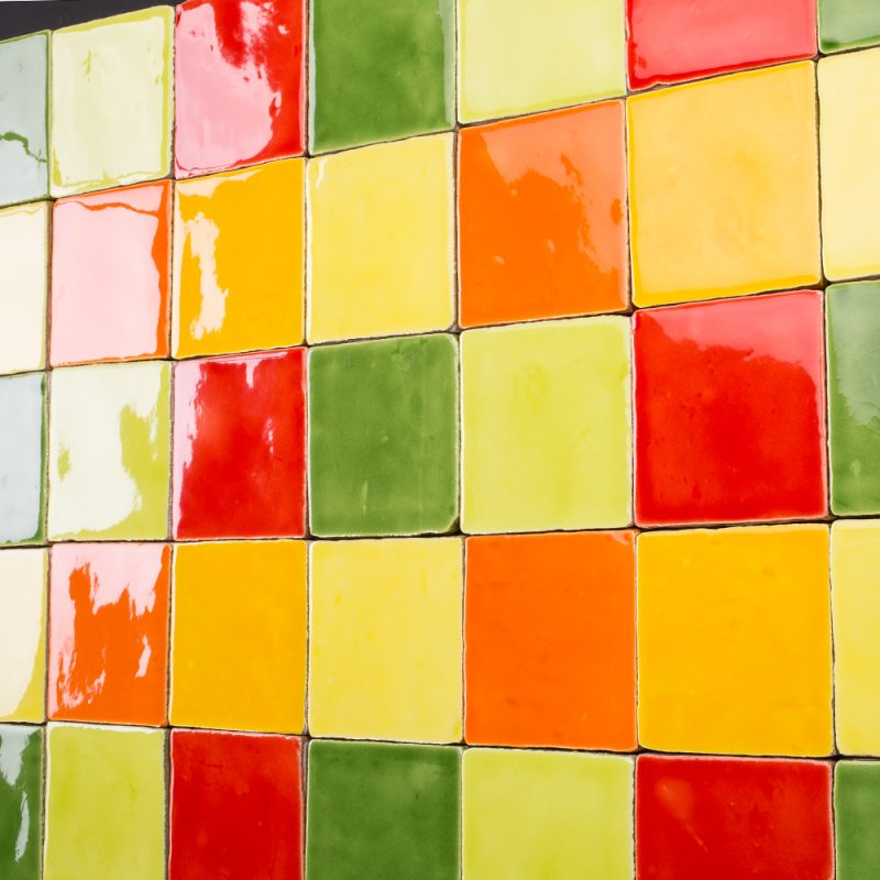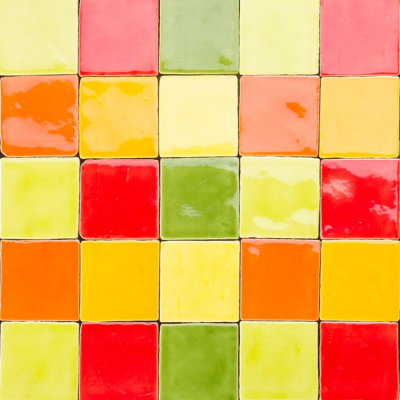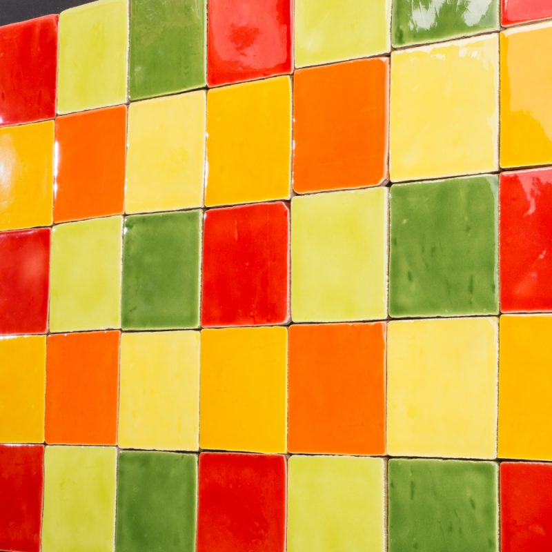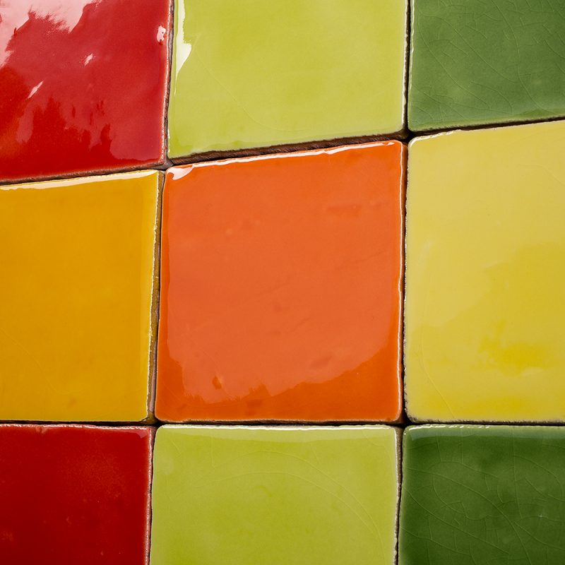 Handgefertigte, aus Lehm gebrannte und einseitig glasierte Wandfliese, Tony´s Küchenspiegelkreationen, gelb orange rot grün mix. Bei einer Musterbestellung müssen 3 ausgewählt werden, dass alle Farben geliefert werden.
