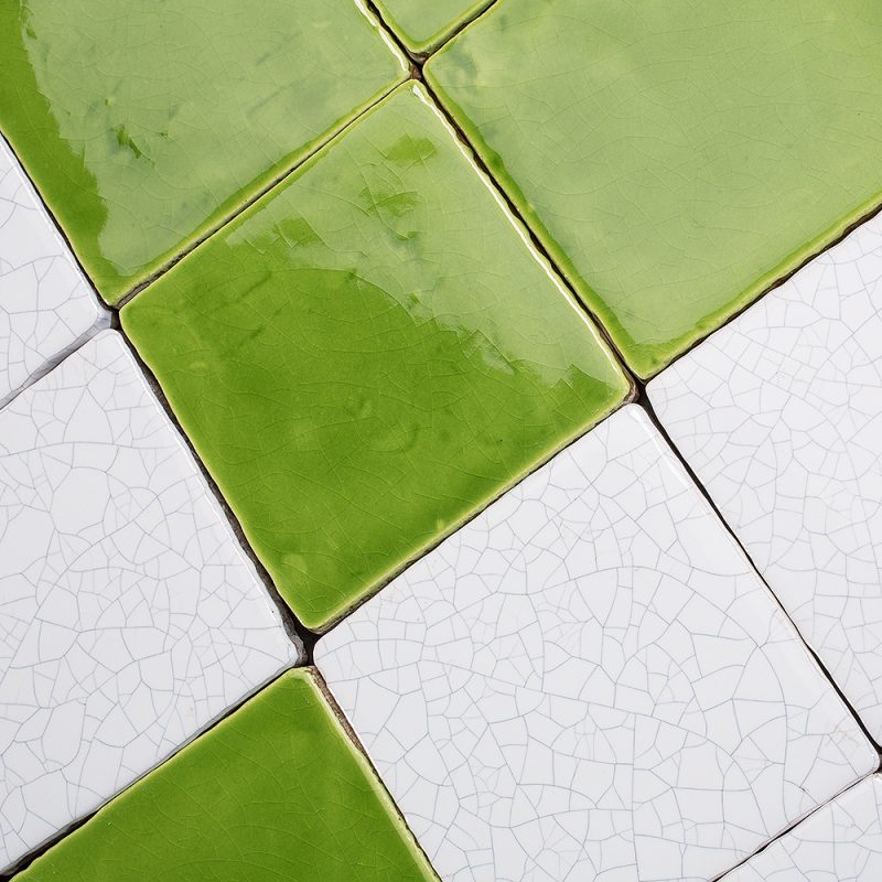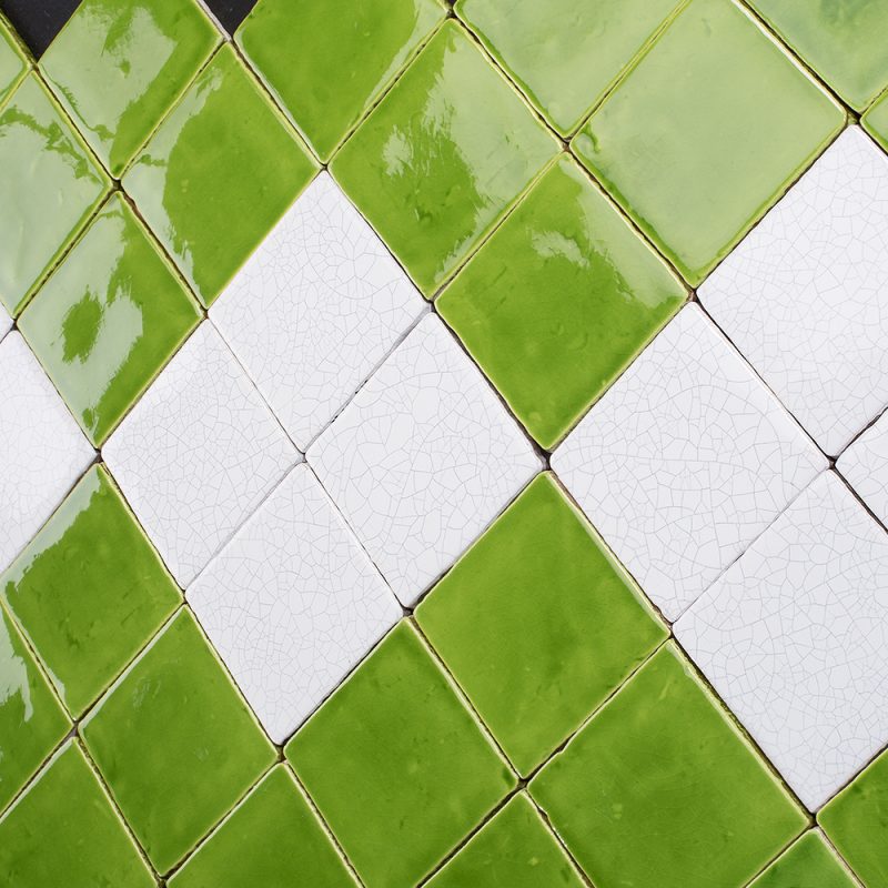 Handgefertigte, aus Lehm gebrannte und einseitig glasierte Wandfliese, Tony´s Küchenspiegelkreationen, irish green mit 4fach weiß craquelé. Bei einer Musterbestellung müssen 2 ausgewählt werden, dass alle Farben geliefert werden.