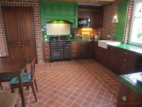 – eigene Farben entweder als Lehmmischung (Bodenfliesen) oder als Glasur (Wandfliesen)