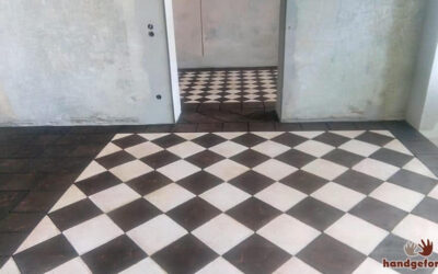 Schachbrettfliesen Art Patina als Bodenbelag für ein neu errichtetes Gartenhaus. Handgeformte Schachbrettfliesen sofort lieferbar