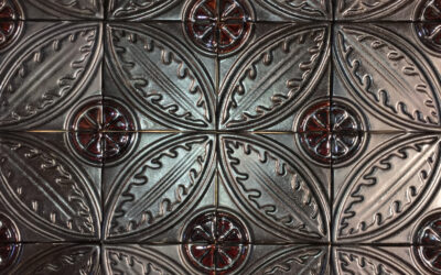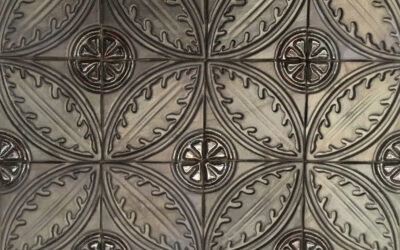 - Detailaufnahme antike Fliesen: braun-schwarz-grau marmoriert, Endbehandlung mit Weichwachs