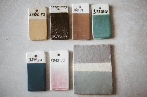 Auch Wandfliesen tragen das Zeichen des Feuers, abhängig davon, wie wir die Oberfläche der Rohlinge abgestrichen und wo wir sie im Ofen platziert haben. In der Hitze verteilt sich die Glasur unregelmäßig-fließend und dringt durch die porige Struktur sogar teilweise ins Innere vor. Alle Fliesen haben nach dem Brand zwar die gleiche Farbe, aber im Feuer sind temperamentvolle Unikate mit changierenden Farbverläufen entstanden.