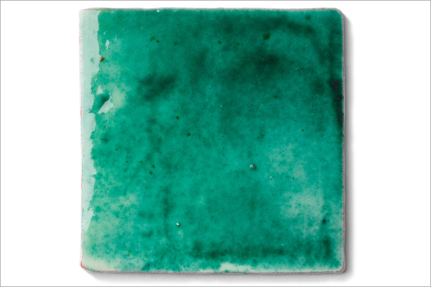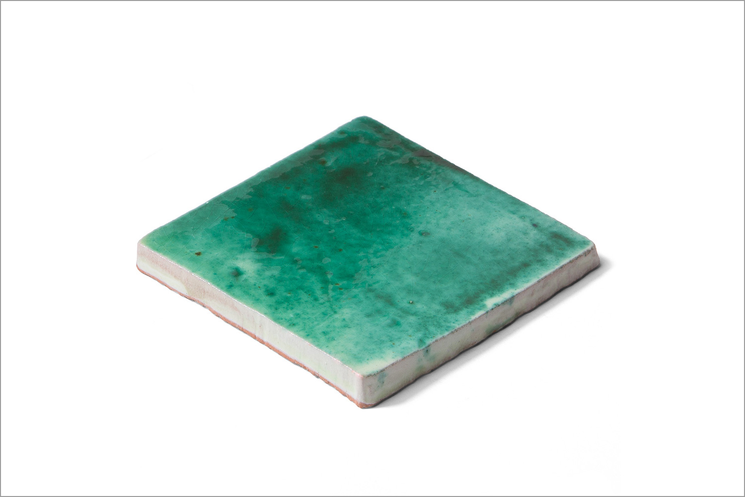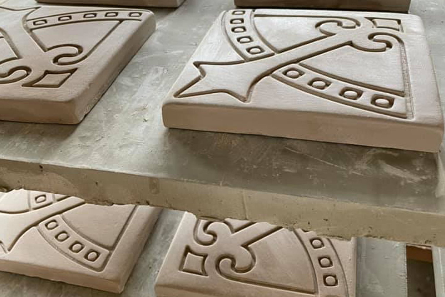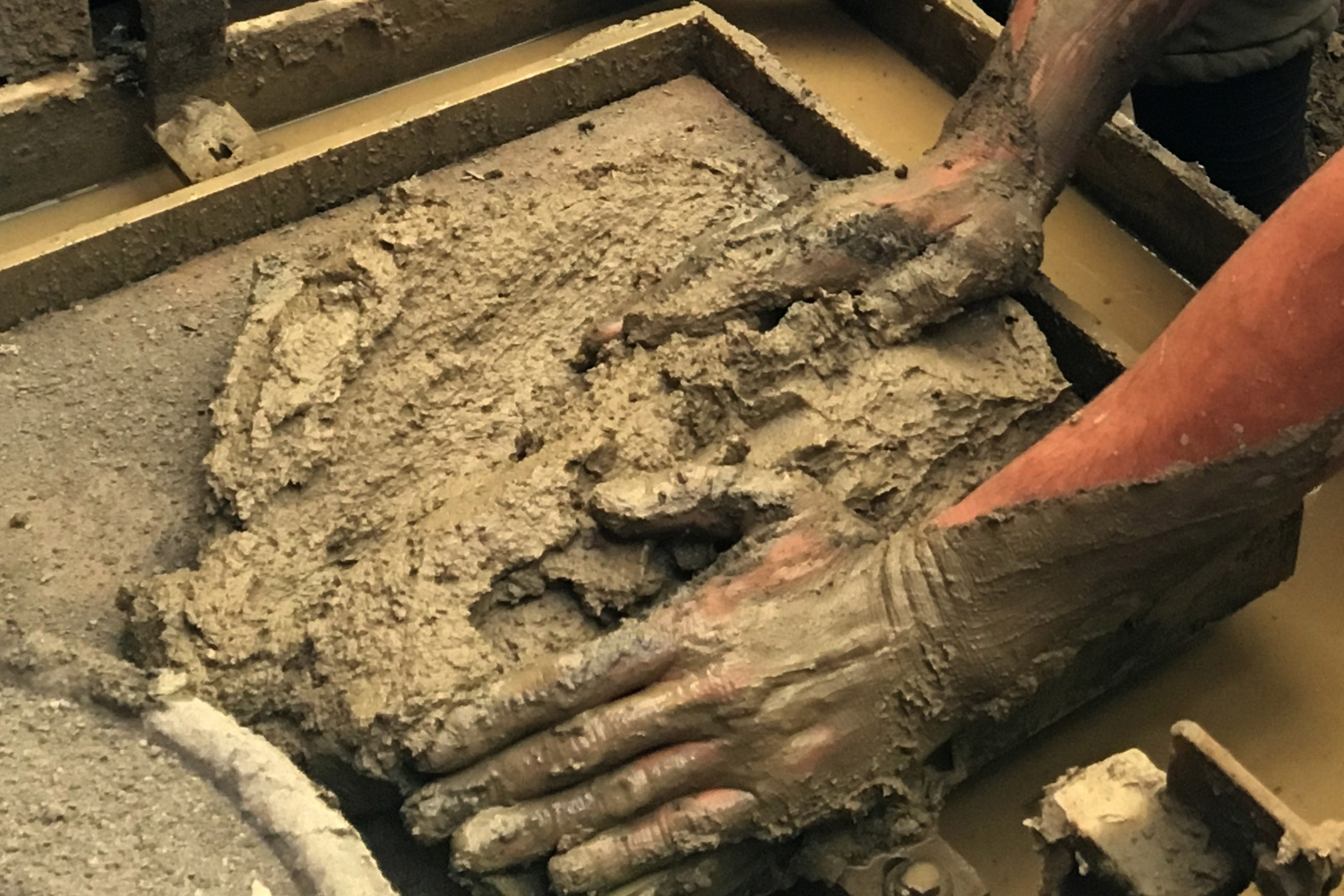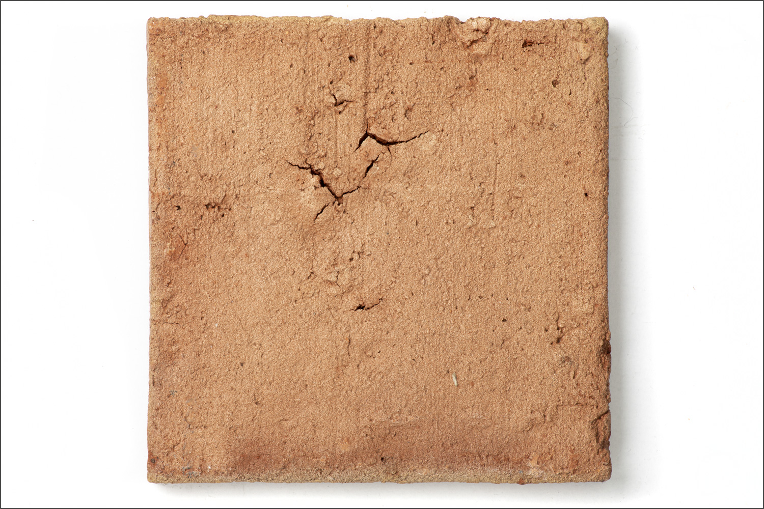Die patentierte Lehmmischung (ohne chemische Zusätze) wird per Hand zur Fliese geformt